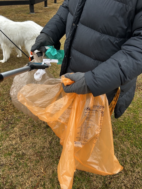Holiday break calls for a father-daughter morning pickup – rain or shine! Fifi was a great sport here; she loves the cold and any excuse to take a walk – especially to support our favorite park! We found a very long receipt, lots and lots of plastic wrappers (including one that had been there so long it started to disintegrate), a metal dip container, a styrofoam cup, and a few plastic bottles among the miscellaneous trash items. Anyway, our hands were numb, but the trash bag was full 😀